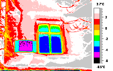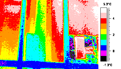 Vlevo: černé teploty v noci. Nevyhřívaná tabule je vlevo. Ve skle se odráží studené nebe (polystyrenová deska za sklem se zobrazuje s hodnotou bližší rovnovážné teplotě exteriéru). Obě rolety jsou stažené dolů. Rozdíl teplot interiéru a exteriéru je 20 K, okno je o 1,5 K teplejší než nevyhřívaný srovnávací povrch. Panovalo bezvětří (teplotní spád mez vnitřním sklem a interiérem byl téměř stejný). Číselná hodnota „U“ vychází kolem 0,6