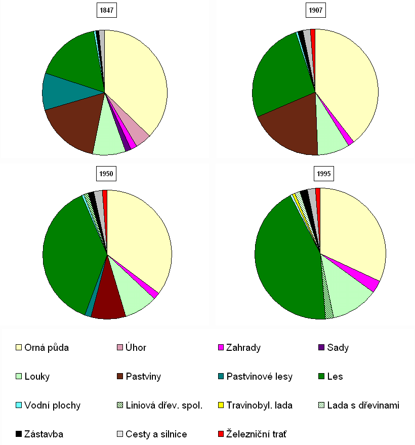 Pro vývoj v 1. polovině 20. století jsou jak v rámci ČR, tak v rámci zájmového území patrné rostoucí trendy u orné a lesní půdy (v obou případech jsou v KÚH vyjádřeny výrazněji: nárůst ploch lesní půdy o 54% , v ČR +4,5%; pokles výměry orné půdy na 85,5% stavu z přelomu 19. a 20. století, v ČR obdobně na 96,7%). Změny se projevují ve struktuře zemědělské půdy, kdy jak případě ČR, tak KÚH dochází k poklesu výměry pastvin.