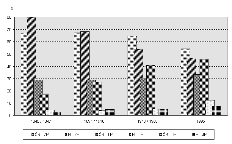 Pro území celé ČR v tomto období dochází k nárůstu ploch zemědělské půdy, který je pokračováním trendu z 1. poloviny 19. století. V důsledku vleklé agrární krize od roku 1873 je však v období 1882 - 1897 pro území ČR zaznamenán pokles rozlohy zemědělské půdy o 0,2%. Rozmach kapitalismu v zemědělství po revoluci 1848/1849 (rychle rostoucí městské průmyslové obyvatelstvo rozšiřovalo trh potravin a zmenšovalo zásoby pracovních sil) vyvolal ještě extenzívnější využívání půdy růstem ploch orné půdy o 7,1% v období 1845 - 1882. Tento trend skončil v následujícím období, kdy se plochy orné půdy již zmenšily o 1,8% (Jeleček, 1995).